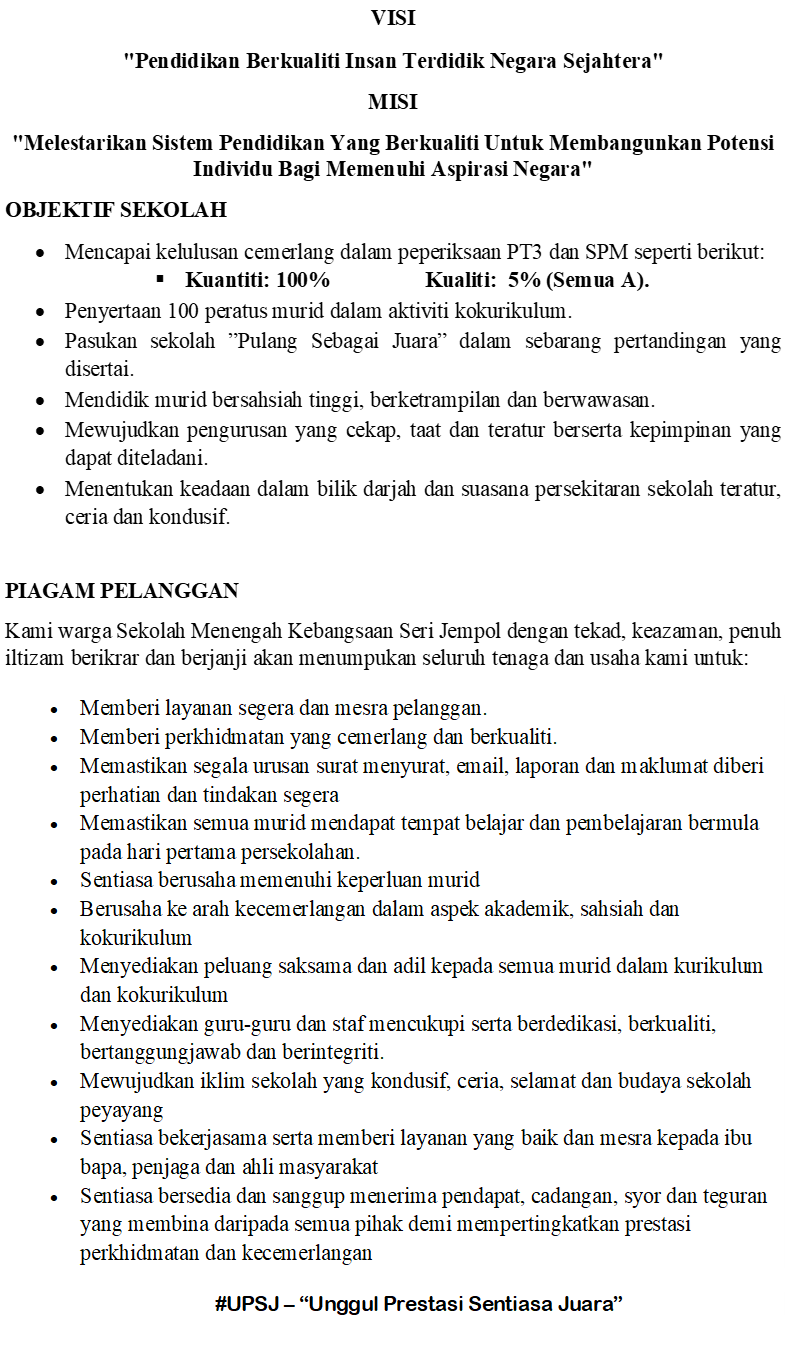 Perancangan merupakan intipati dalam pengurusan organisasi. Perancangan yang bersistematik dan strategik menjadi petunjuk arah utama kepada kejayaan dan kecemerlangan dalam semua aspek pendidikan. Justeru itulah SMK (F) Seri Jempol menghasilkan Portal sekolah.