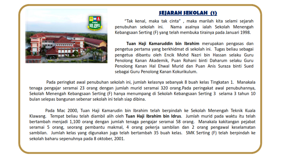 Portal ini akan menjadi bahan rujukan kepada semua warga sekolah dan masyarakat setempat. Dengan ini perancangan sekolah akan dapat dilaksanakan dengan cekap, mantap dan berkualiti, sesuai dengan moto sekolah "Bersama Menjana Kecemerlangan" Akhirnya saya ingin mengambil kesempatan ini untuk mengucapkan setinggi-tinggi penghargaan dan terima kasih yang tidak terhingga kepada unit ICT sekolah yang terlibat dalam penyediaan dan penghasilan Portal ini.